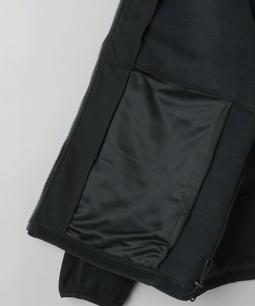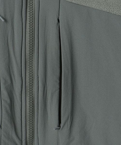 胸もとにはファスナー付きのセキュリティポケットを、脇にはハンドウォーマー機能を備えたファスナーポケットをあしらいました。