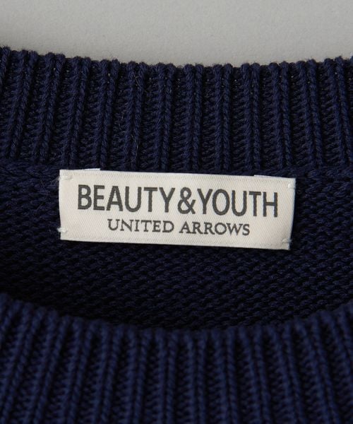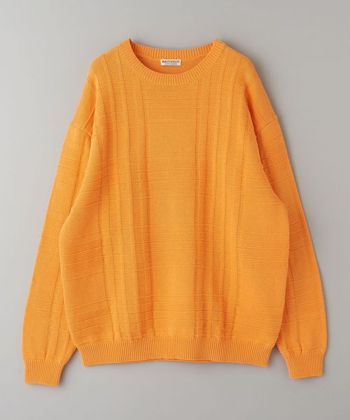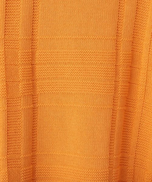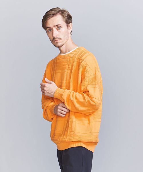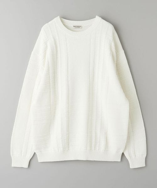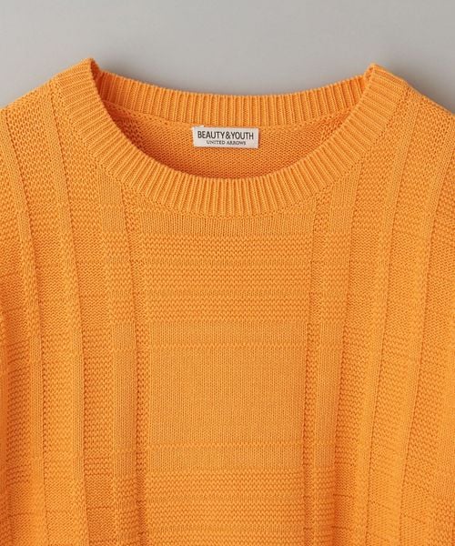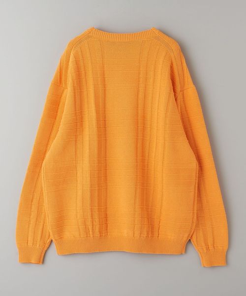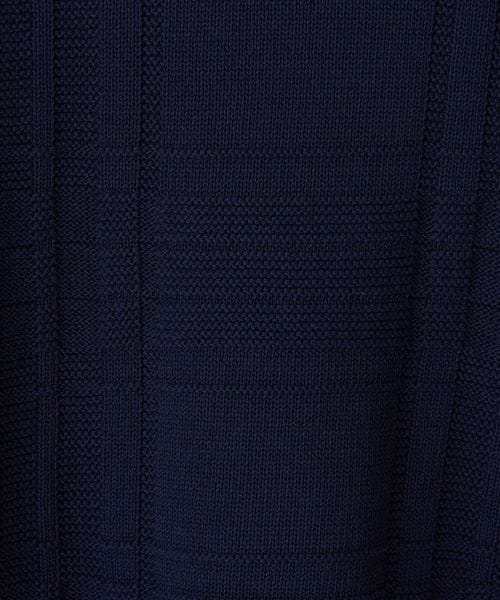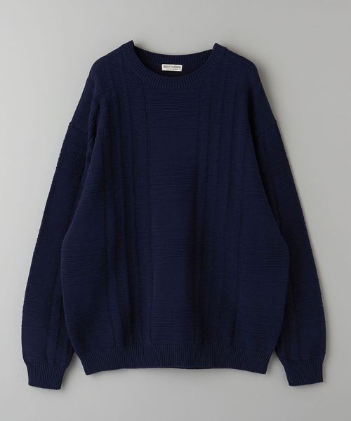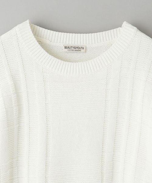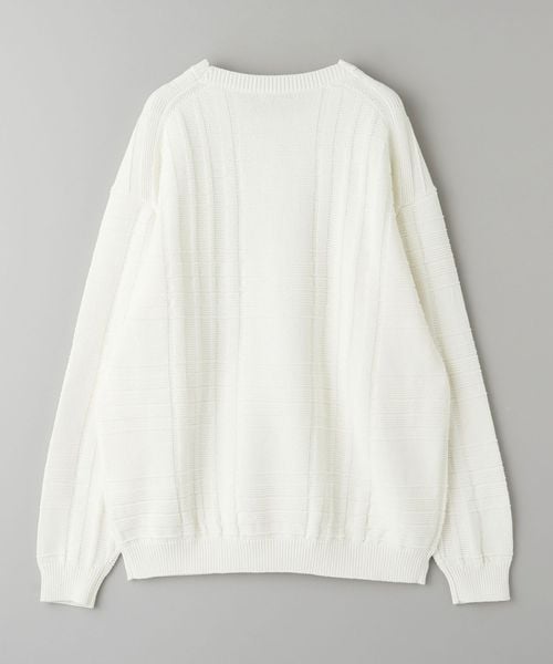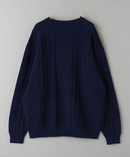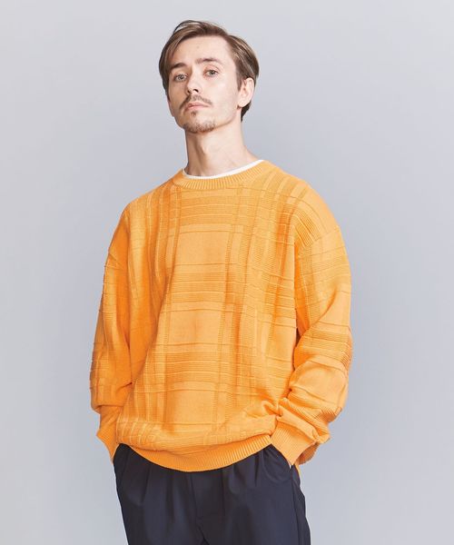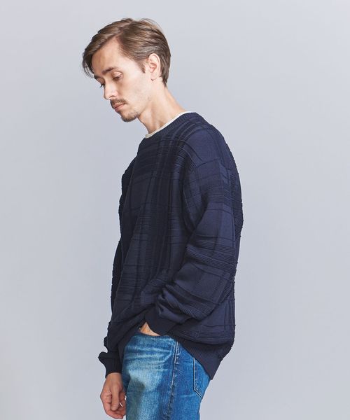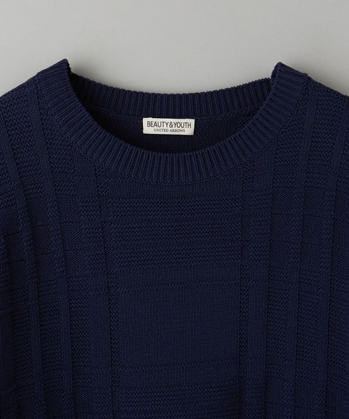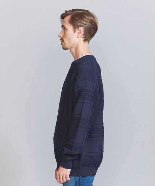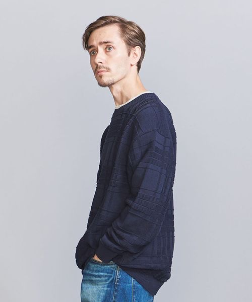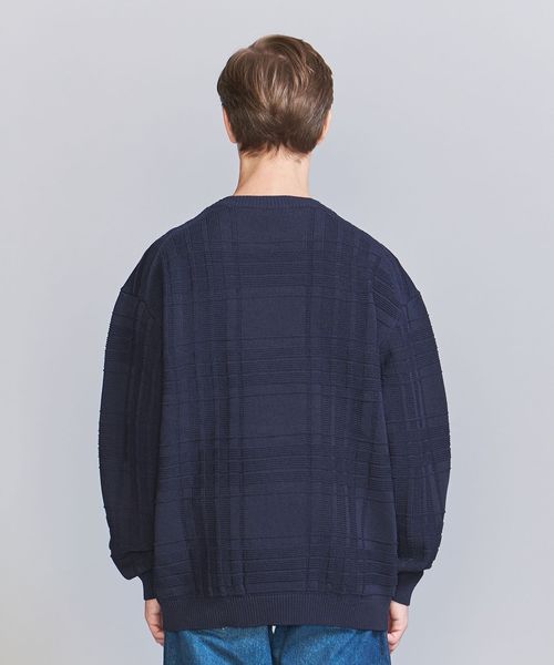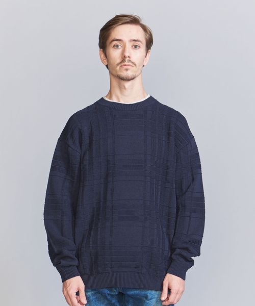 編みでチェック柄を表現したデザインが目を惹くクルーネックニット。