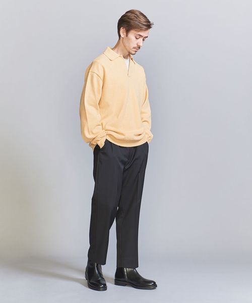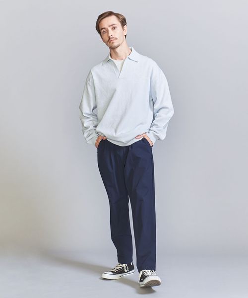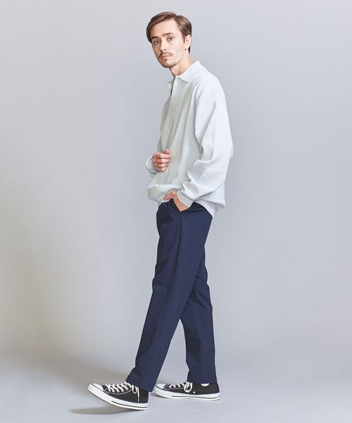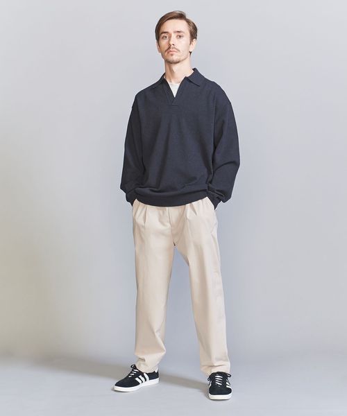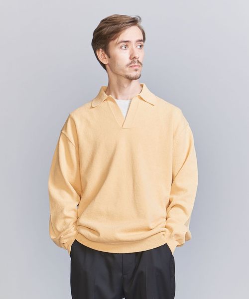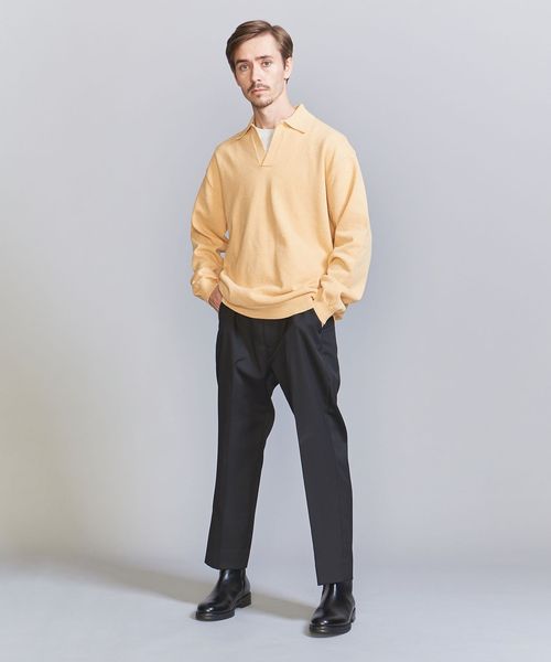 シンプルな着こなしで、「今」っぽい雰囲気にまとまるスキッパーポロニット。