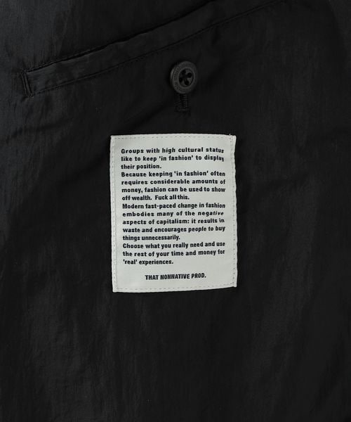洋服とは、人生を投影するための道具である。<nonnative>は、そんな普遍的なアーカイヴ(道具)の中から、用途に合った生地・丈夫な縫製・実用的なディテールといった「機能」を抽出。時流にあったシルエットに再編集する。