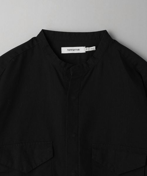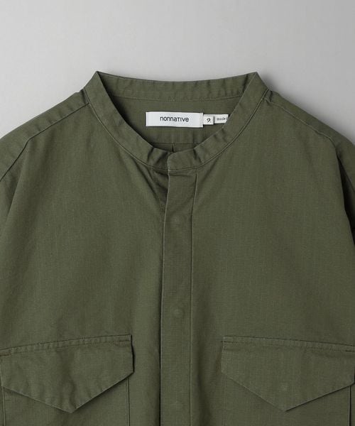 両胸のフラップポケットが特徴のスタンドカラーシャツです。