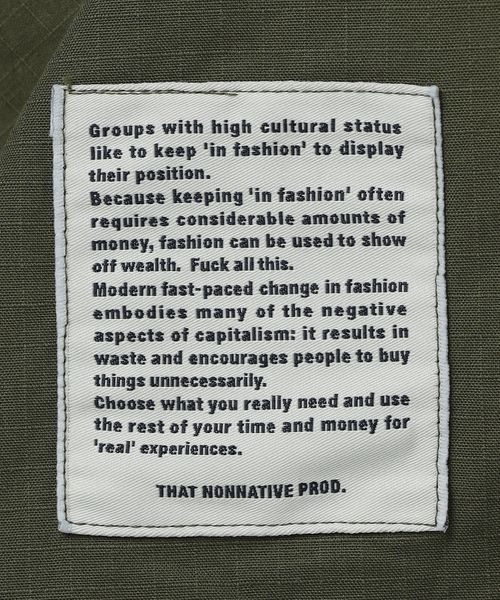 洋服とは、人生を投影するための道具である。<nonnative>は、そんな普遍的なアーカイヴ(道具)の中から、用途に合った生地・丈夫な縫製・実用的なディテールといった「機能」を抽出。時流にあったシルエットに再編集する。
