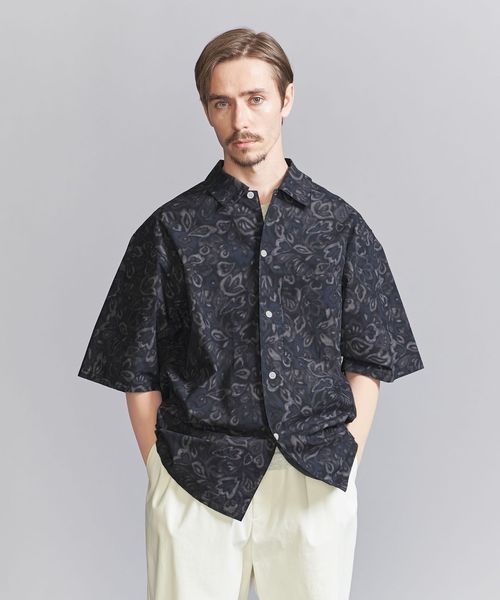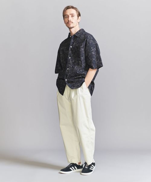 一枚着としても映える為、きれいめなスラックスやイージーパンツに足元はグルカサンダル、レザーサンダルを合わせ、リラックスムード漂う着こなしや、モノトーンの柄行を活かして、ダークトーンでシックなカラーコーディネートにもおすすめです。
