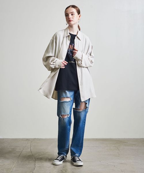 ぬけ感のある広めの身幅、アームホールと腕幅のバランスが絶妙なドロップショルダー、大胆な着丈