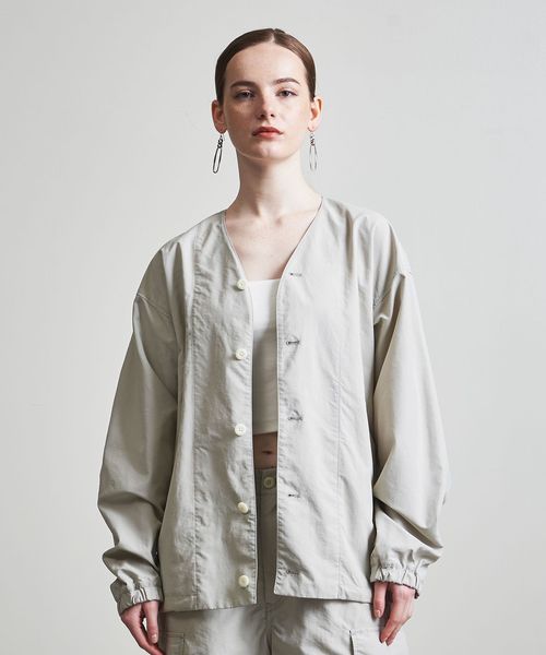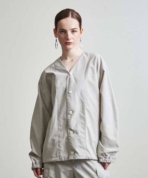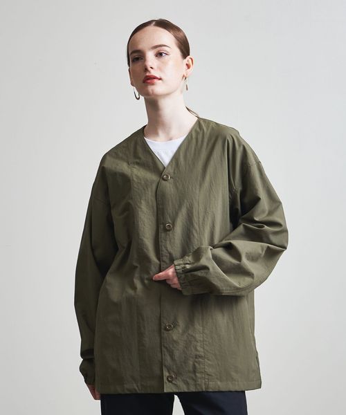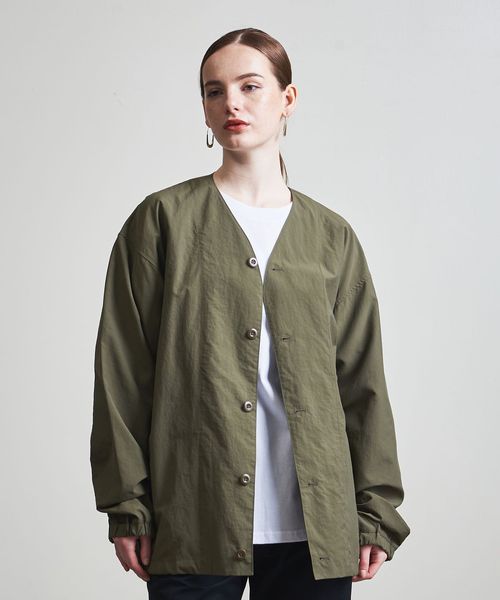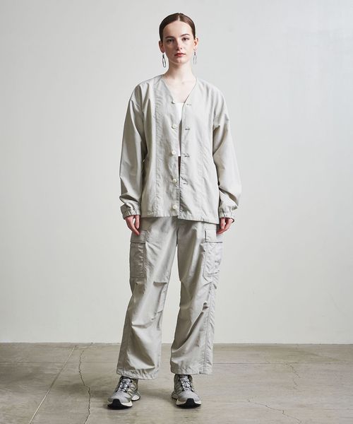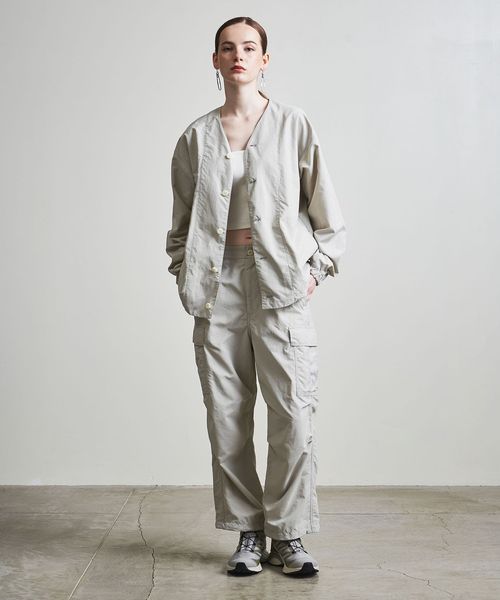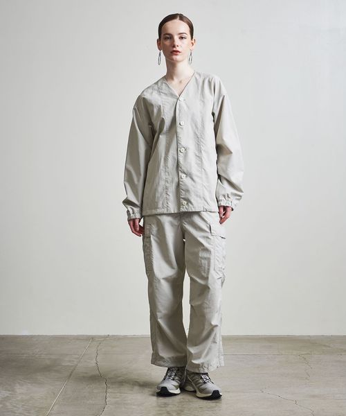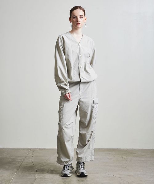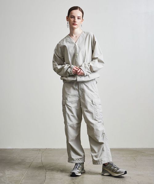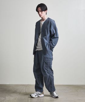 コットンのような見た目とタッチ感が特徴で、リップストップの組織感があることでこなれ感がありナイロン素材の軽さはありつつも、ボリュームのあるシルエットも綺麗にでます。
