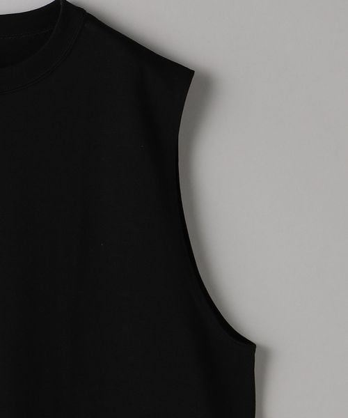 締まった首元が上品な印象で、ゆったりとドレープ感あるボックスシルエットのノースリーブT。
