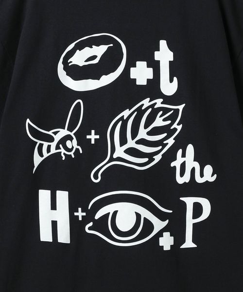 背面にユニークなアートワークがデザインされたクルーネックTシャツ。
