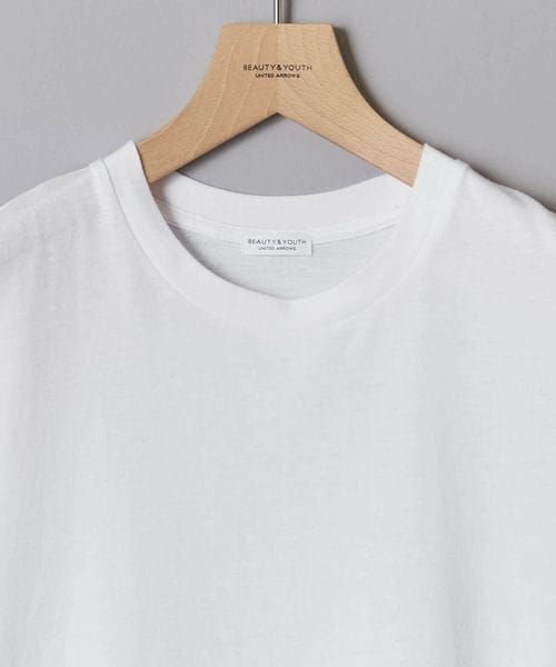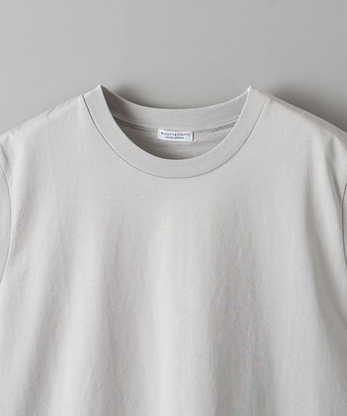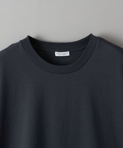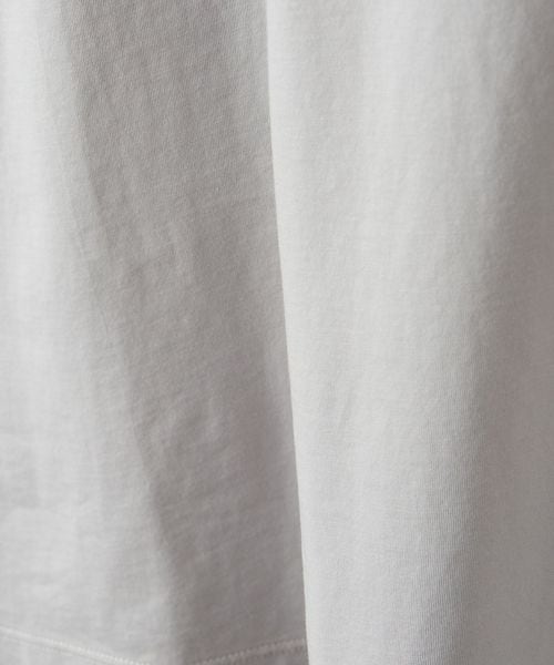 糸の段階で毛羽を焼いて品の良い微光沢を出し、目を詰めて編み立てた一枚でも着られるきれいめコットン天竺素材を使用しています。