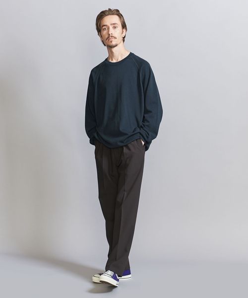 秋・春には一枚でさらりと、肌寒い冬場にはジャケットやアウターの中に入れてレイヤードスタイルに。