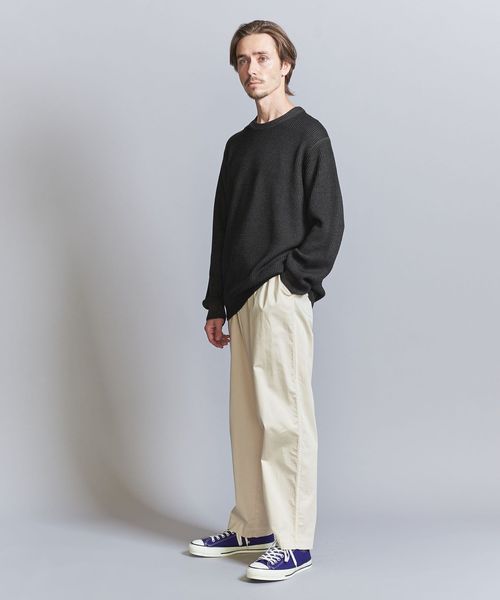シンプルにスラックスやデニム、足元はローファー等の革靴を合わせた、品よくクリーンな着こなしはもちろん、スウェットパンツやジョガーパンツ、スニーカー等を合わせたスポーティなスタイルも好相性。