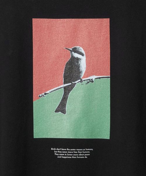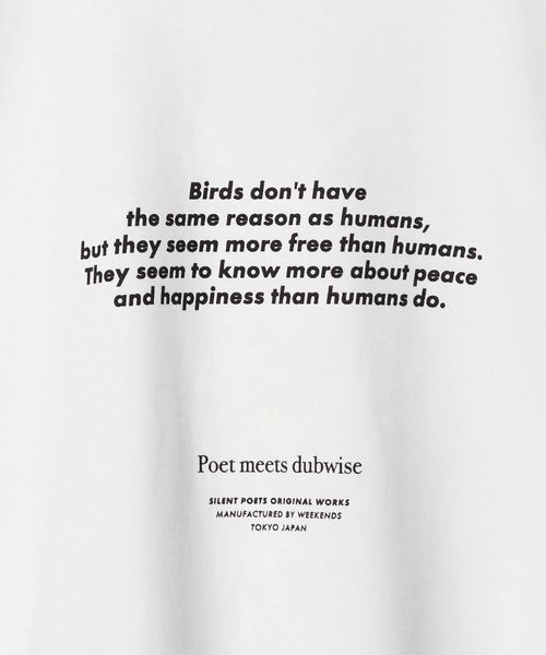 フロントには鳥のグラフィック、バックには詩的なメッセージがプリントされ、静かに語りかけるような存在感を放ちます。
