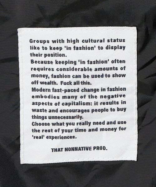洋服とは、人生を投影するための道具である。<nonnative>は、そんな普遍的なアーカイヴ(道具)の中から、用途に合った生地・丈夫な縫製・実用的なディテールといった「機能」を抽出。時流にあったシルエットに再編集する。