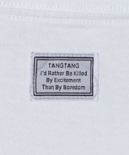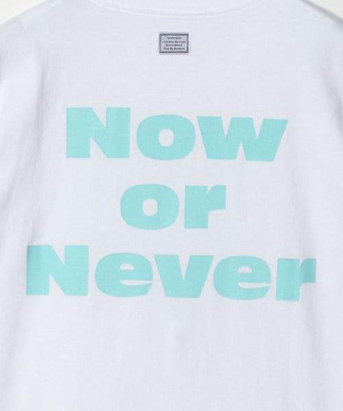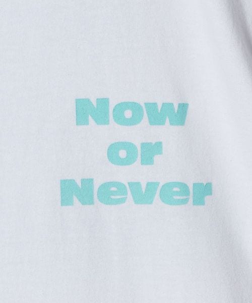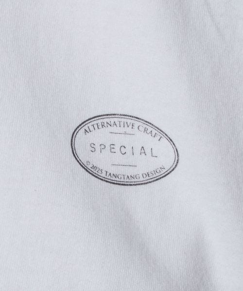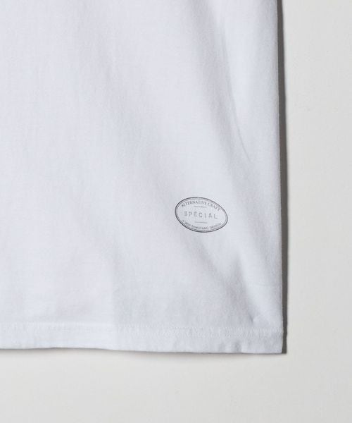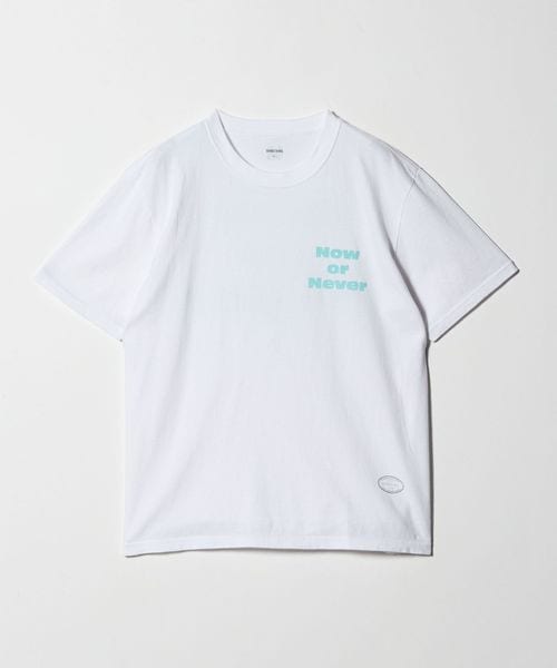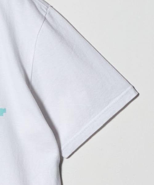 ホワイトボディにライトブルーのテキストプリントが際立つ、爽やかな印象の一枚。