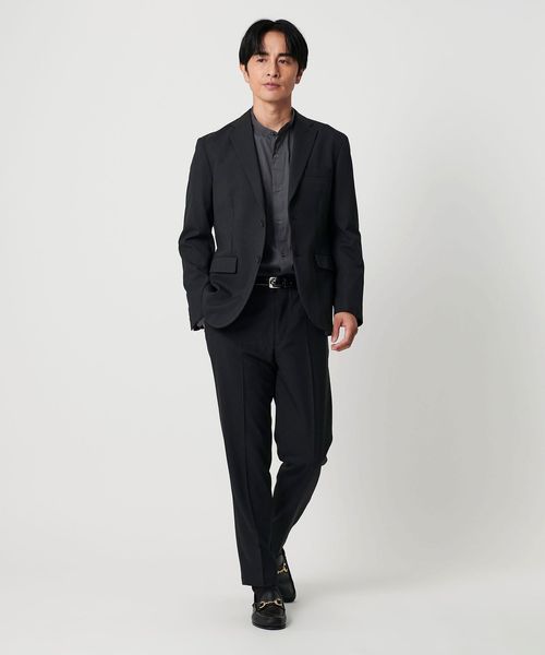 同素材のスリムスラックスと合わせたセットアップスタイルなら、オンオフ問わず洗練された着こなしが可能。