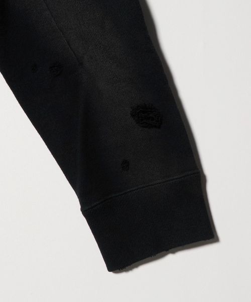ヴィンテージスウェットのようなリアルなダメージや色褪せの加工が施されたスウェットシャツ。