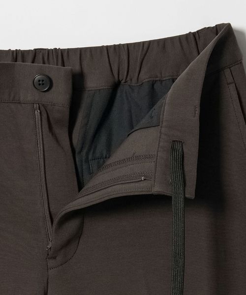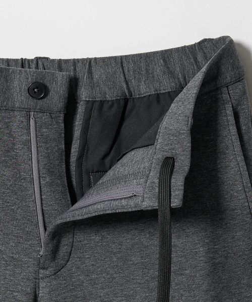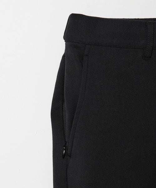 前開きでゴムシャーリングとスピンドルで、楽にウエスト調節でき、脇はスラッシュポケットと右脇側のみにファスナー開きのセキュリティーポケットがあり使い勝手の良さもポイントです。後身は両玉縁ポケットで、スポーティなスエットパンツとは違うスマートな見た目がポイントです。