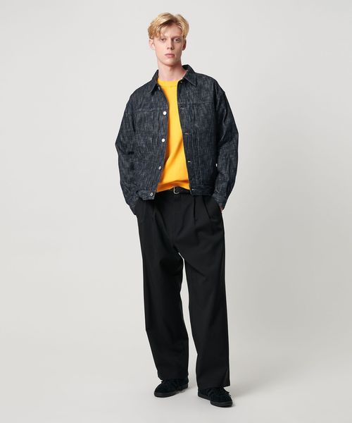 凹凸のある表情豊かなデニムには、平織りのスラックスやブロードシャツ、天竺カットソーなど、ベーシックなアイテムとのスタイリングがおすすめ。