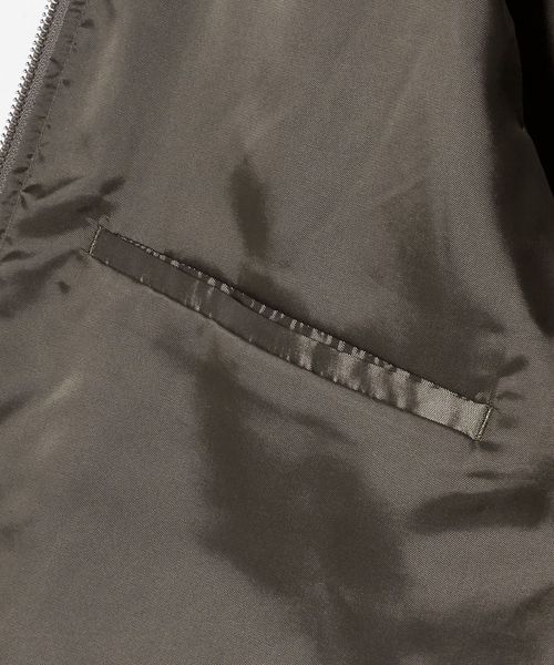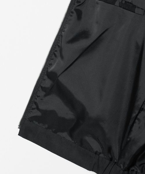 フロントジップに衿はポリエステルニットリブとミニマルにまとめたデザインとディテール。