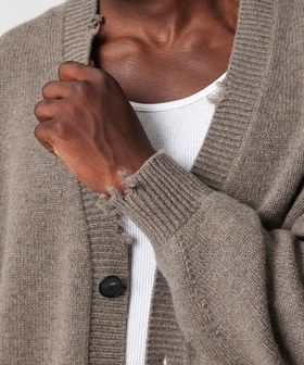 クラシックなVネックのフォルムに、クラッシュディテールでさりげないアクセントをプラス。