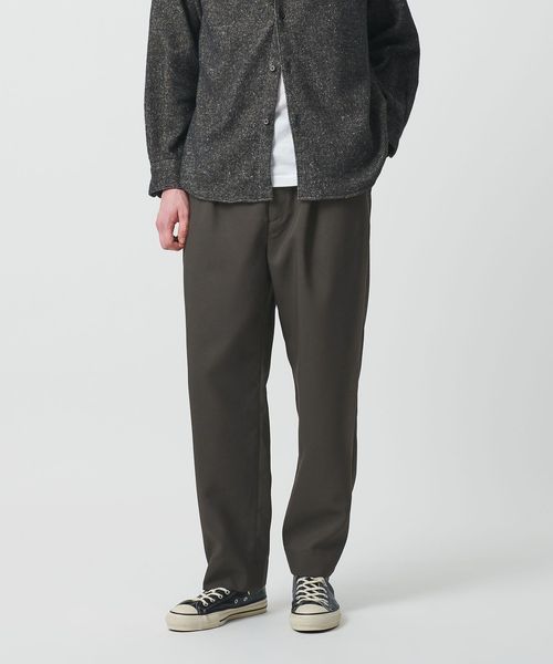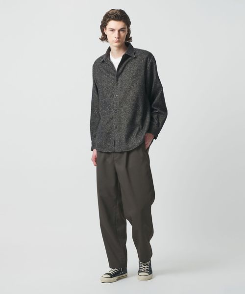 ウーステッド調のフラットな表情を持つため、毛足のあるニットや加工感のあるスウェットなど、素材に表情のあるトップスとの組み合わせがおすすめ。