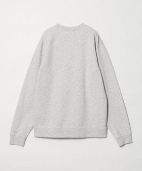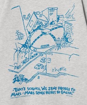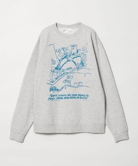 落ち着いたグレートーンに、鮮やかなブルーのイラストが映えるスウェット。