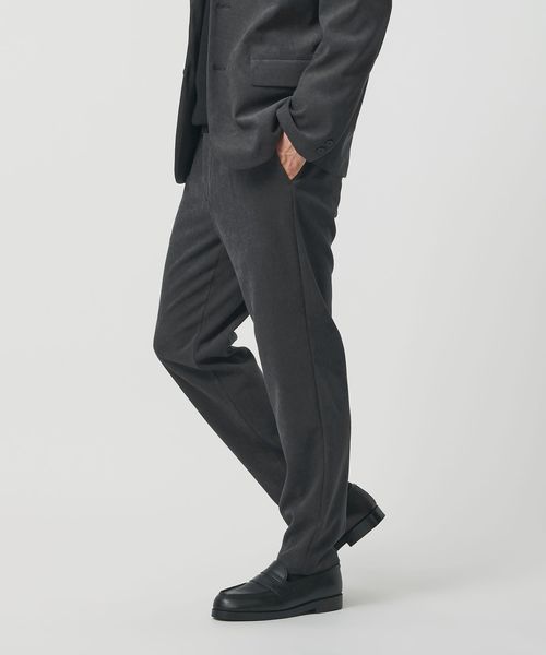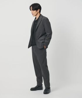ウール系ではない季節感のある生地を使ったセットアップは珍しく、秋冬のスタイリングに新鮮さをもたらします。