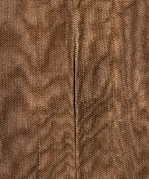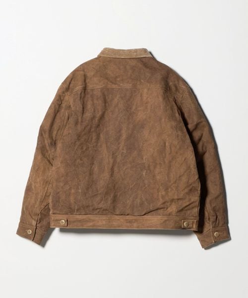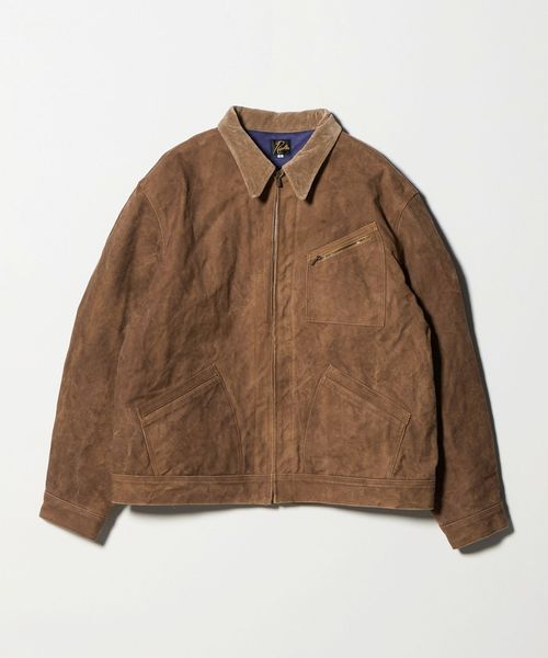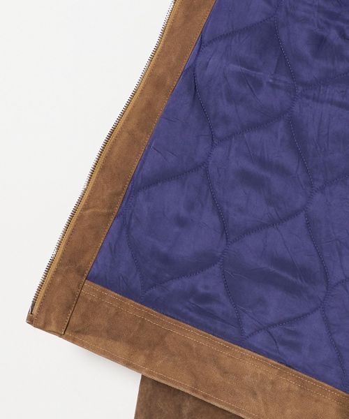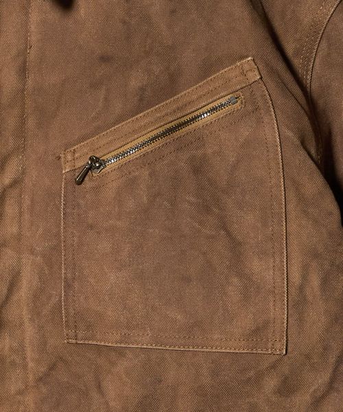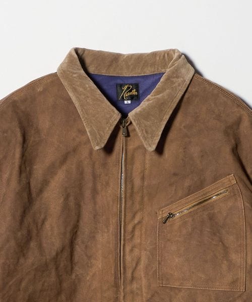 深みのあるブラウンカラーと無骨なワークテイストに、ジップ仕様とベルベット調の襟が上品なアクセントを添えています。