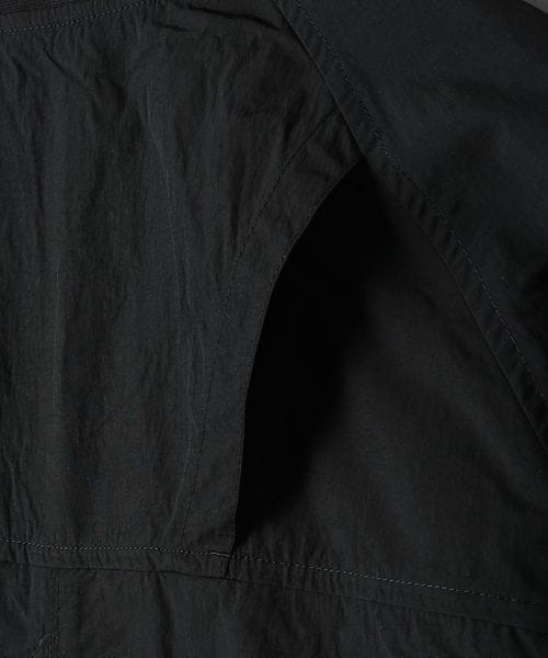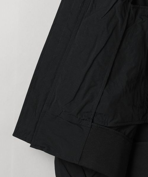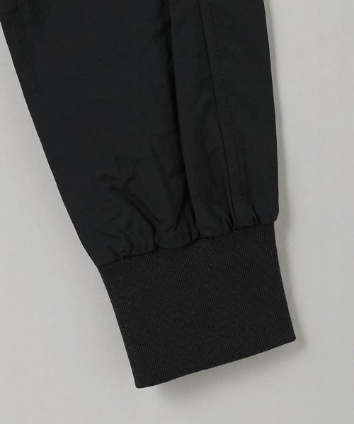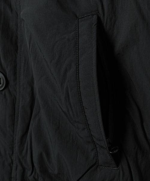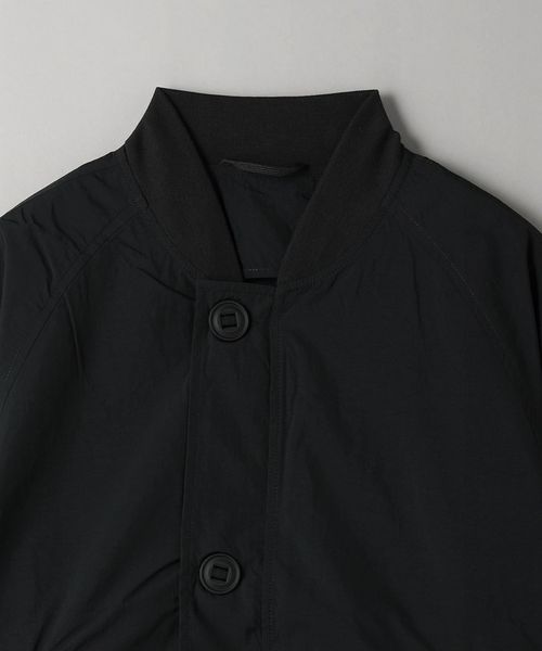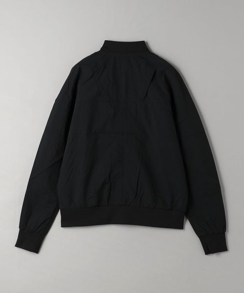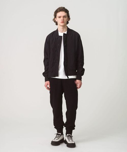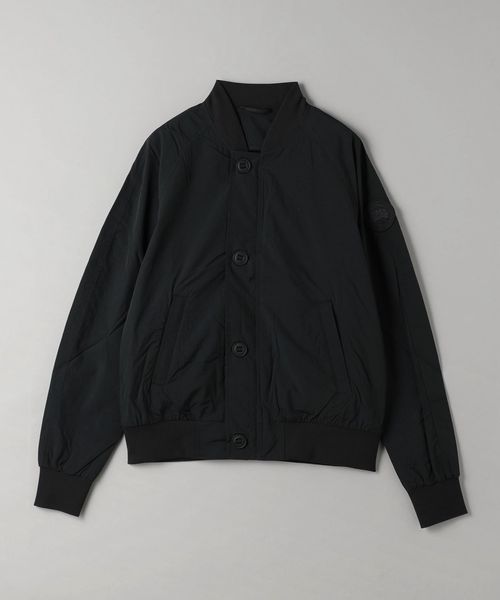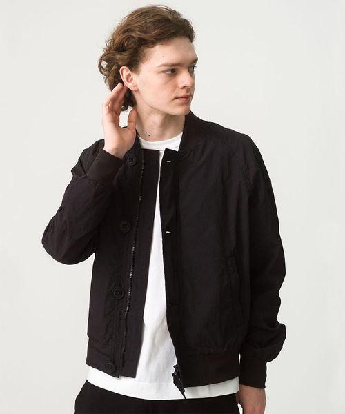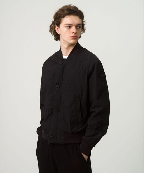 クラシックなボンバーのシルエットで、フロントにはボタン付きの前立て、ジッパー付きのハンドポケットを備え、襟と裾はリブニットで仕上げています。