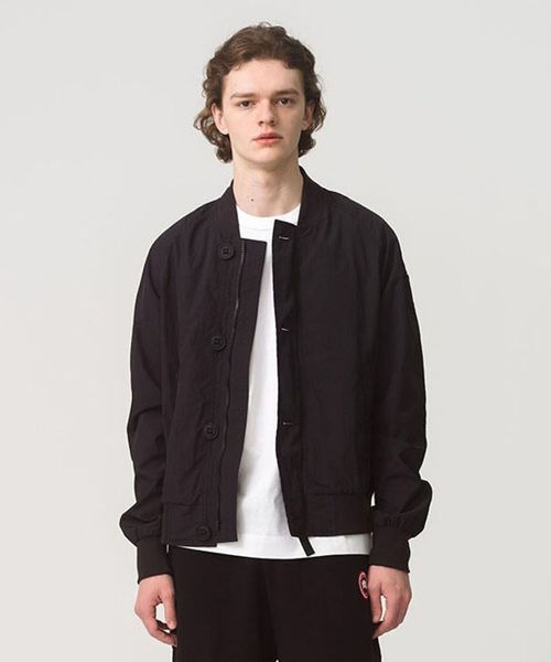 クラシックなボンバーのシルエットで、フロントにはボタン付きの前立て、ジッパー付きのハンドポケットを備え、襟と裾はリブニットで仕上げています。