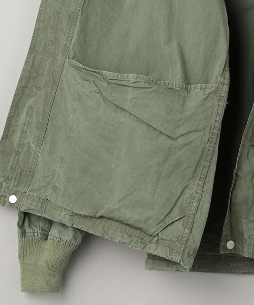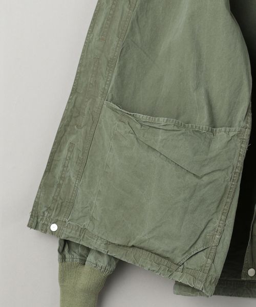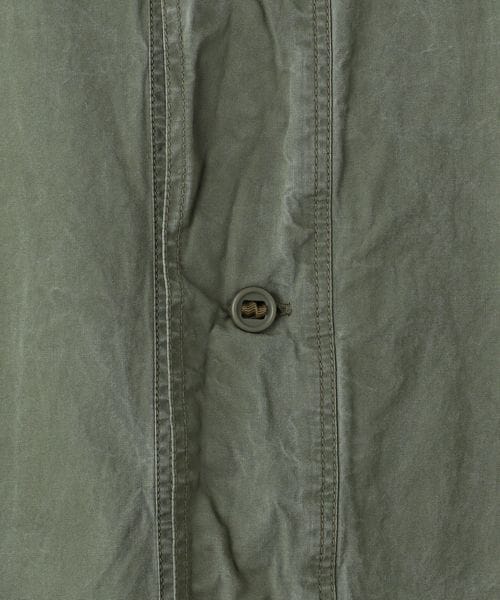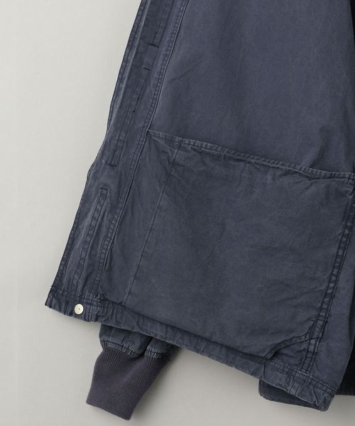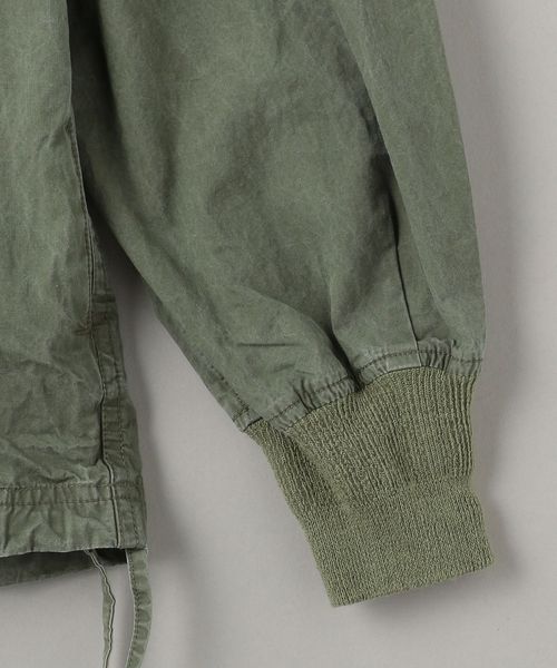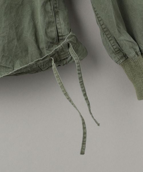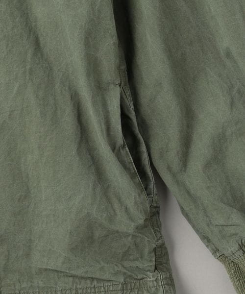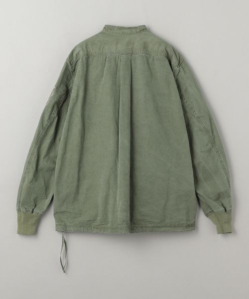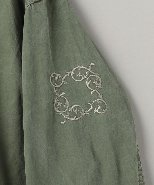 ミリタリージャケットとコーチジャケットを織り交ぜたデザインで、左腕に配された刺繍、左裾に備えられた平紐がアクセントとなっています。