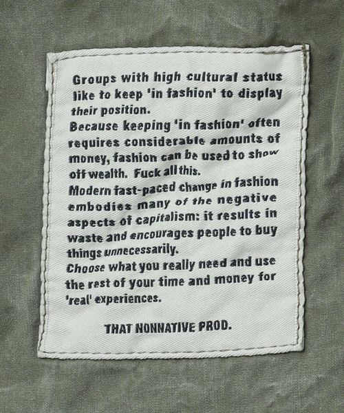 洋服とは、人生を投影するための道具である。<nonnative>は、そんな普遍的なアーカイヴ(道具)の中から、用途に合った生地・丈夫な縫製・実用的なディテールといった「機能」を抽出。時流にあったシルエットに再編集する。