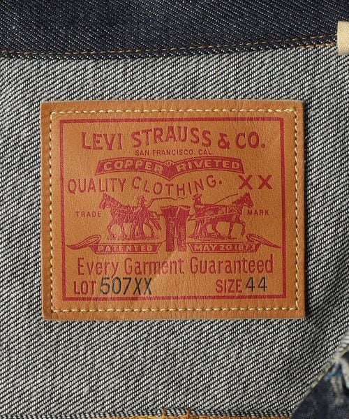 「Two Horse」のロットナンバー507レザーパッチ、ダブルプリーツが入った前立て、ウエストのアジャスターと大文字の「E」のレッドタブが特徴です。