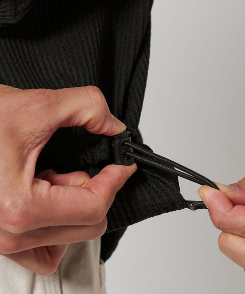 身幅はゆとりがあるワイドなシルエットで、裾周りにスピンドルを回しご自身ですぼめたりシルエット調整可能なデザイン。