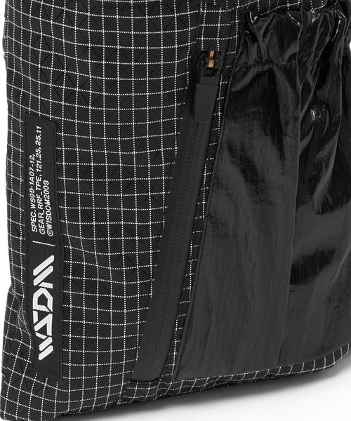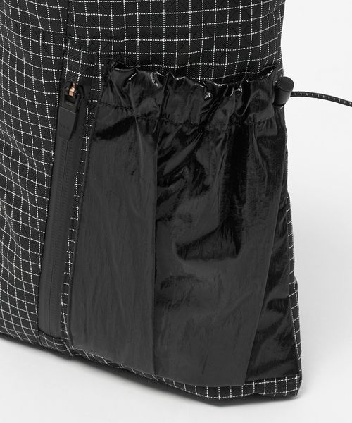 斜めに走る別布ポケットや巾着仕様の開口部など、随所に実用的かつエッジの効いたディテールを完備。