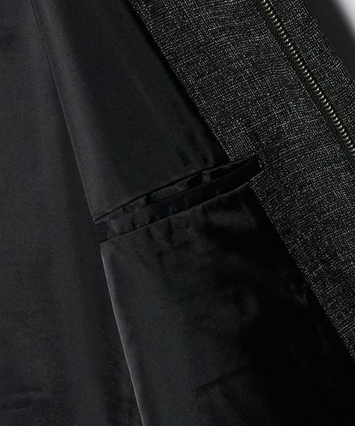 ファスナーエレメントを隠した比翼仕様や、腰ポケットの片玉縁仕様など、控えめなディテールでツイード素材の美しさを引き立てました。