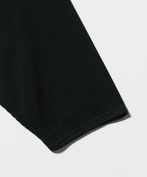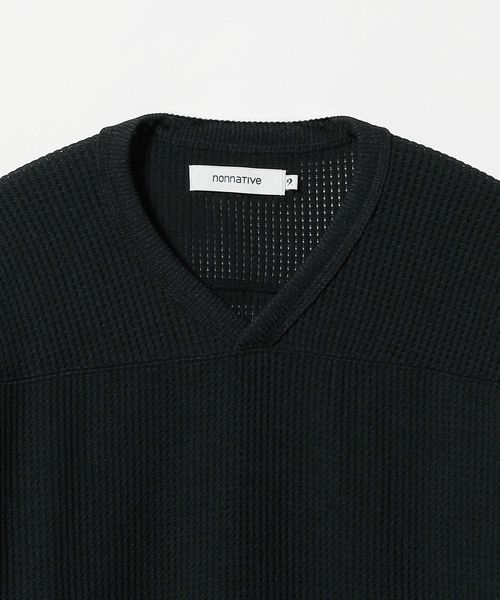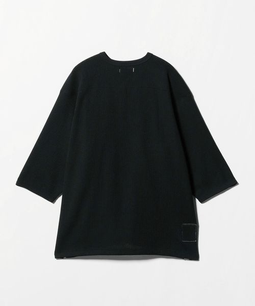 立体感のある編み地が印象的な、Vネック仕様の7分袖フットボールTシャツ。