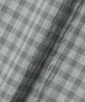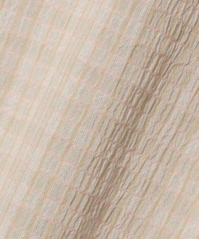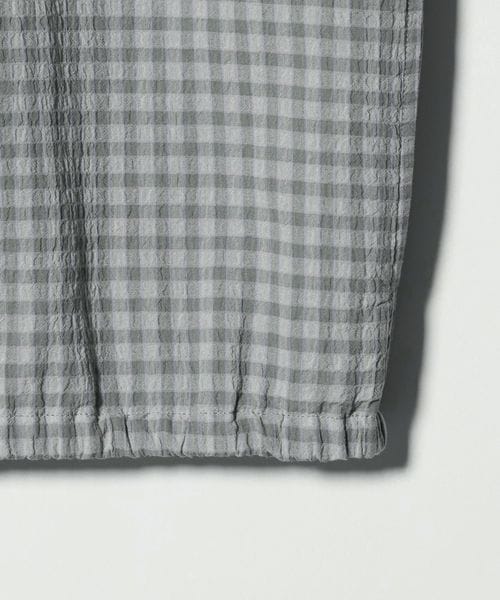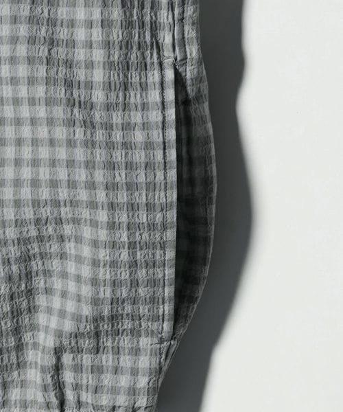 チェック柄とシャーリングのさりげない表情がスタイルに奥行きを与え、シンプルな着こなしでも自然と洒落感が漂う仕上がりに。