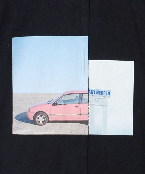 胸元には、過去のコレクションから象徴的な2つのイメージを切り取り、ずらしたシームで分割・歪ませたアートワークを配置。