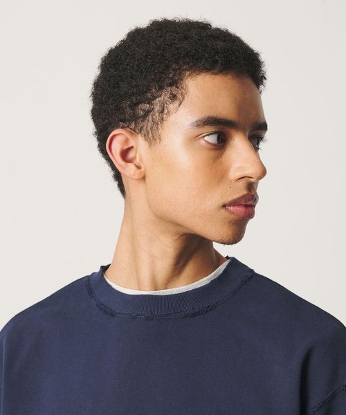 ネックまわり・裾口・アームホールなど、要所の縫い目に手作業でダメージを施したクラッシュスウェット。