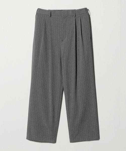 裾までストンと落ちる、ストレートに近いワイドシルエットのピンストライプスラックス。