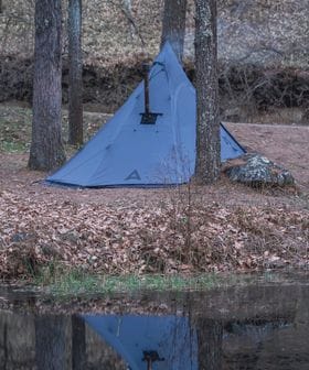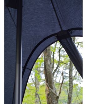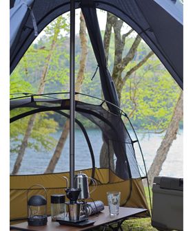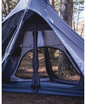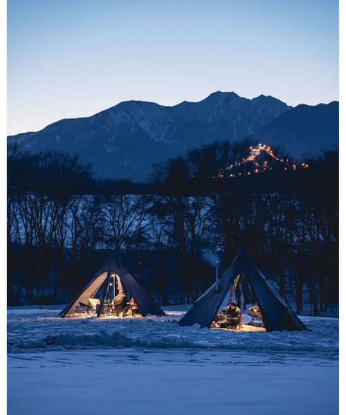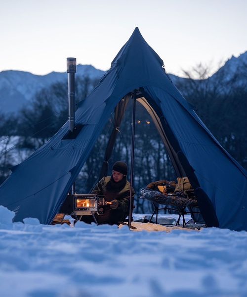メッシュ付きの入り口・巻き上げ可能なスカートを備えているので夏場でも快適に過ごすことができ、薪ストーブをインストールすれば厳冬期での使用も可能です。