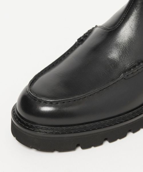 モカシンディテールがさりげなく効いた、ブーツタイプのレザーシューズ。