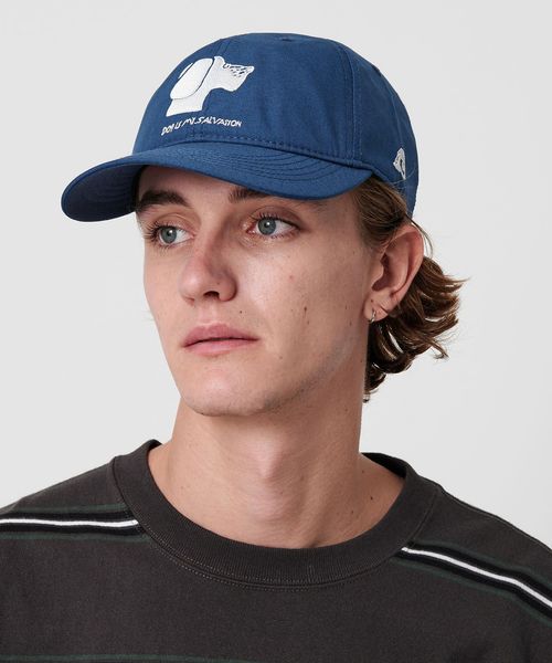 ブルーボディにワンダフルな刺繍が映える、6パネルキャップ。