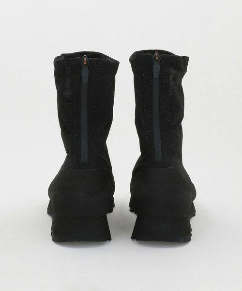 着脱をスムーズにする後ろ足首にあるバックファスナーは、雨水や砂利などの浸入を軽減するガゼット構造です。