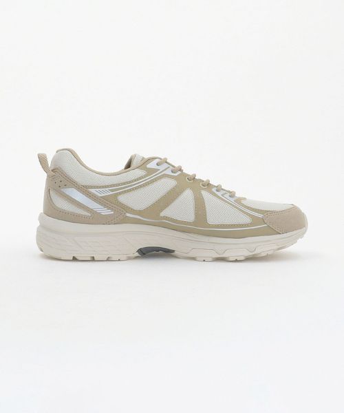 トレイルシューズのディテールを取り入れたアッパーとアウトソールに、柔らかなベージュトーンを重ね、落ち着きのある雰囲気に仕上げました。