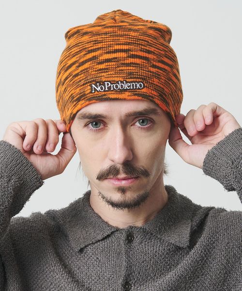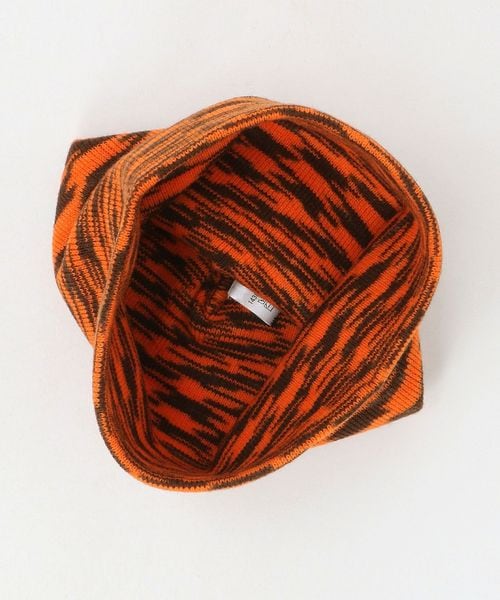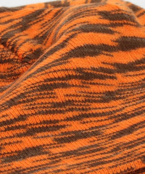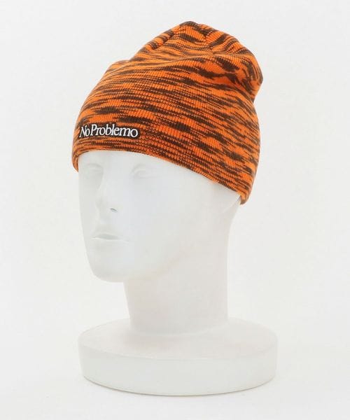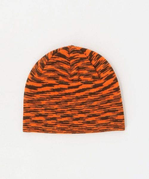 デジタル画面のノイズを思わせる模様と鮮やかなオレンジカラーが印象的なニットキャップ。