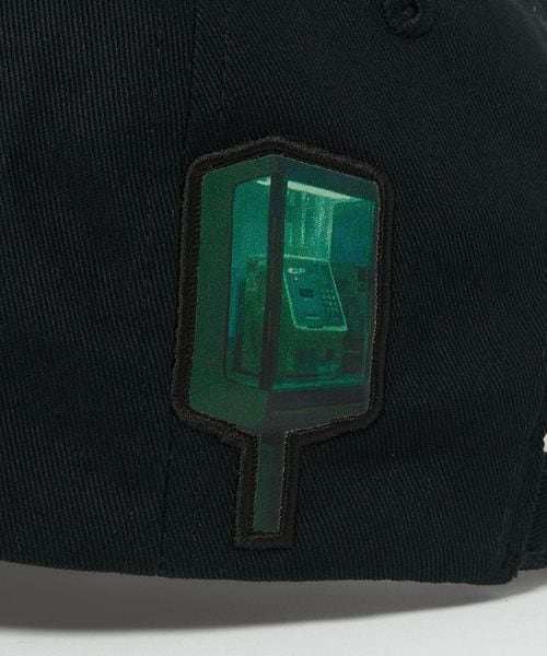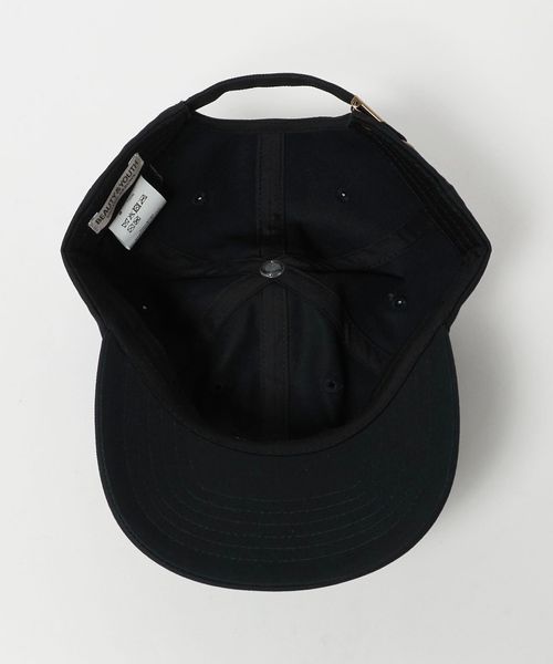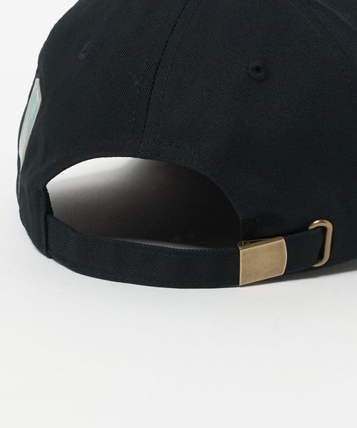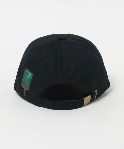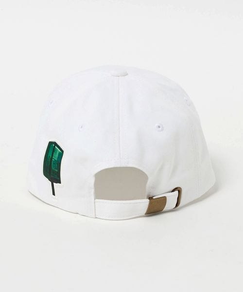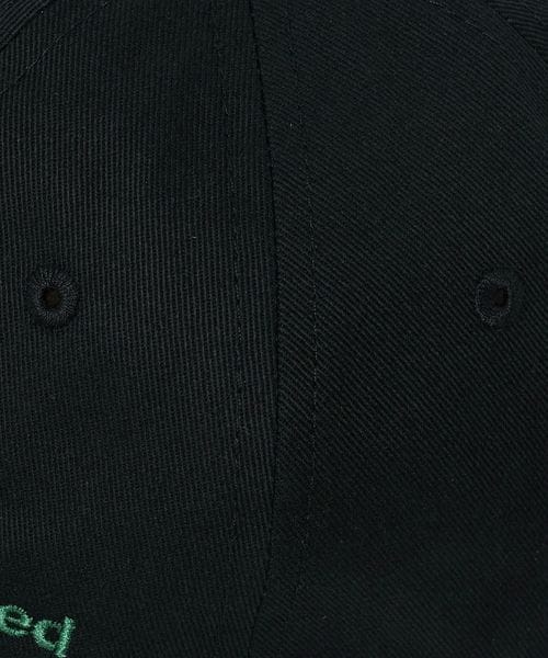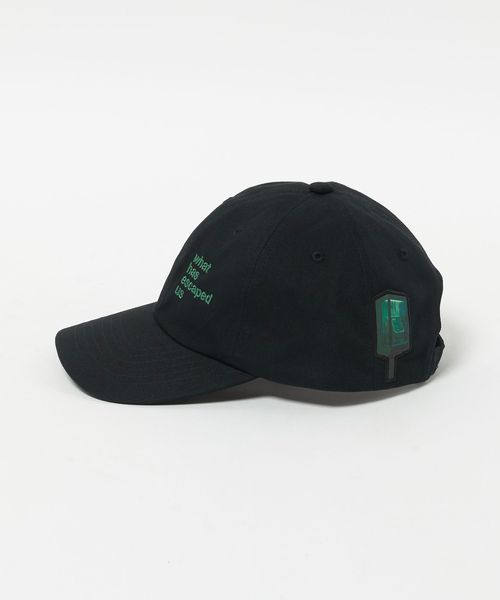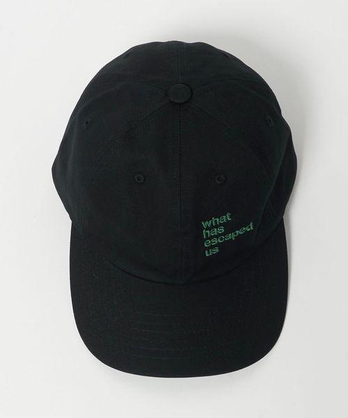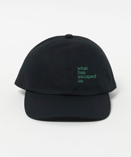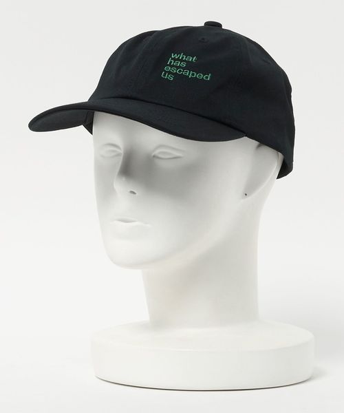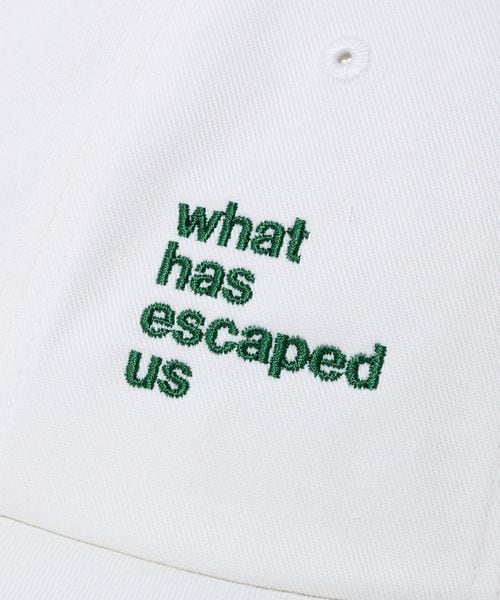 左前面に今回の展覧会のタイトル"what has escaped us"の文字を刺繍で施した6パネルキャップ。