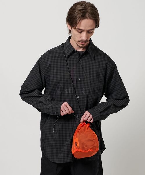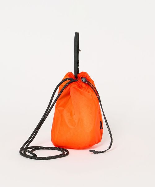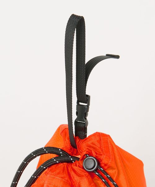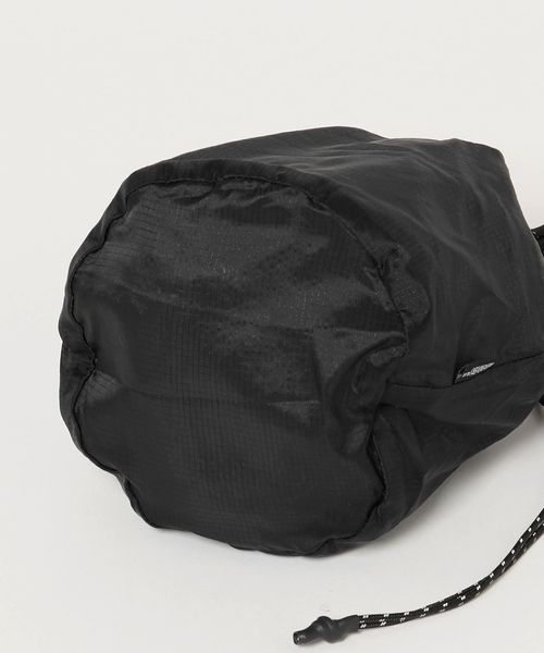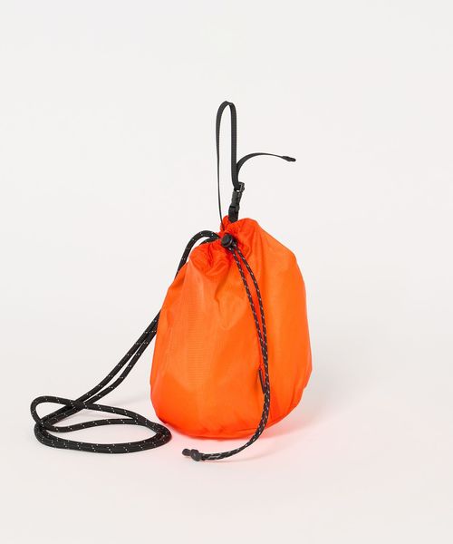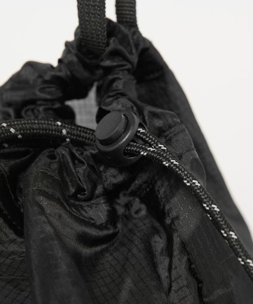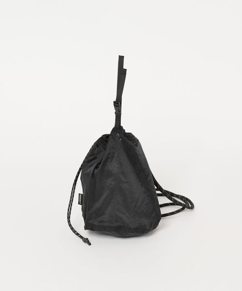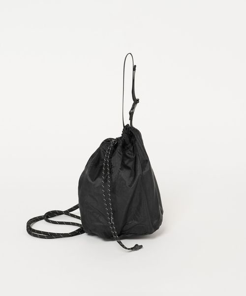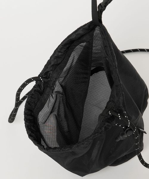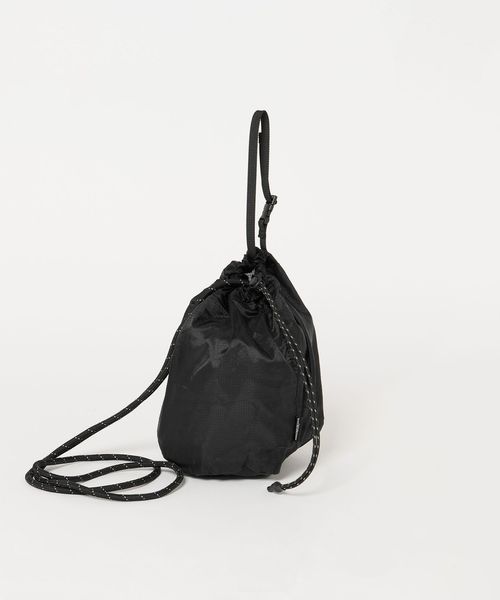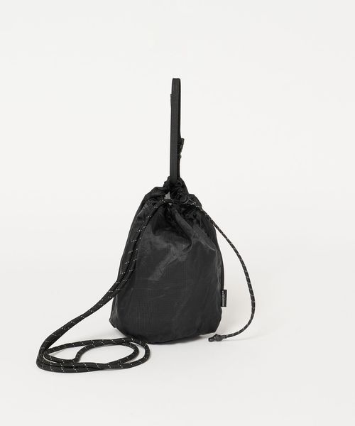 リップストップナイロンを使用した、ショルダーストラップ付きの巾着バッグ。