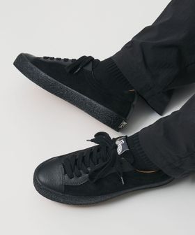 ゆったりとしたストリートスタイルには自然に馴染みつつ、オールブラックの配色が足元を引き締めます。