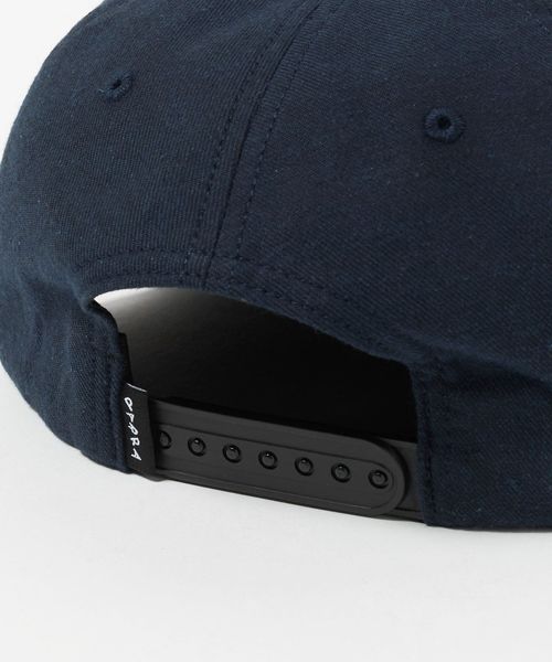 ブランド名をモチーフにした起毛パッチをフロントに大胆にあしらった6パネルキャップ。